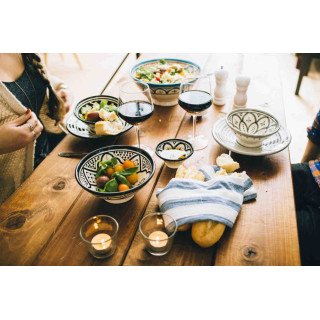 Vi har ett brett utbud av vackert marockansk keramik som kommer att lysa upp ditt bord och vi har återvunnet munblåst glas som ger en rusitk känsla...